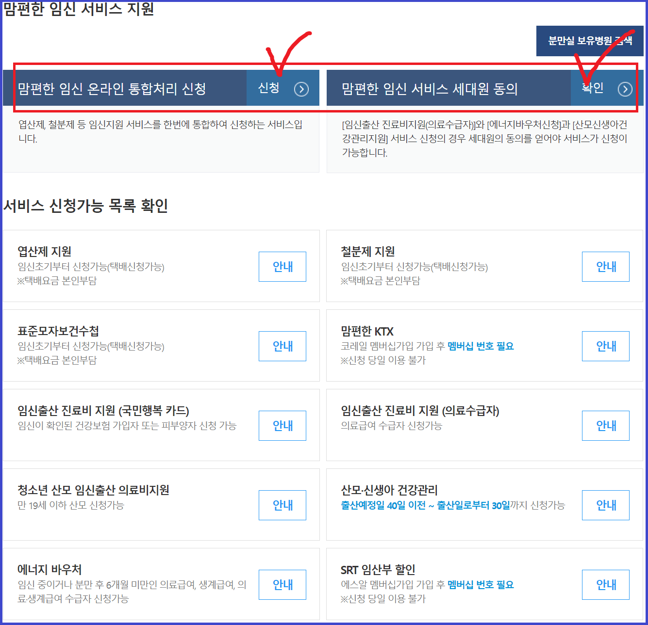혹시나 메인 홈페이지로 이동했을 경우 스크롤을 조금 내리면 '원스톱 서비스'가 있습니다. 해당 내역에서 '맘편한 임신'으로 들어가시면 위와 동일한 탭으로 넘어가게 되고 통합처리를 통해 가능한 목록을 모두 신청할 수 있습니다.