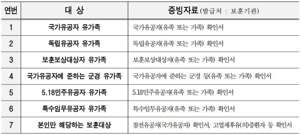 국가보훈 관계법령에 따른 대상자이면서 아래 증빙자료를 제출하는 경우에만 해당됩니다.